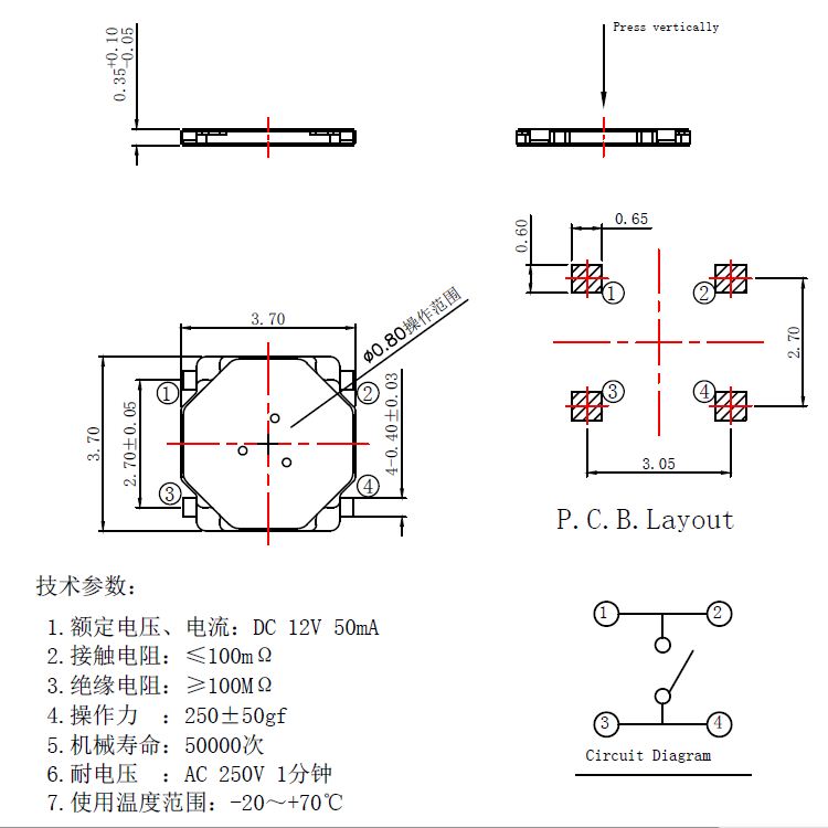 規(guī)格:3.7mm*3.7mm ? ? ? ? ? ? ? ? ?力度:250士50gf