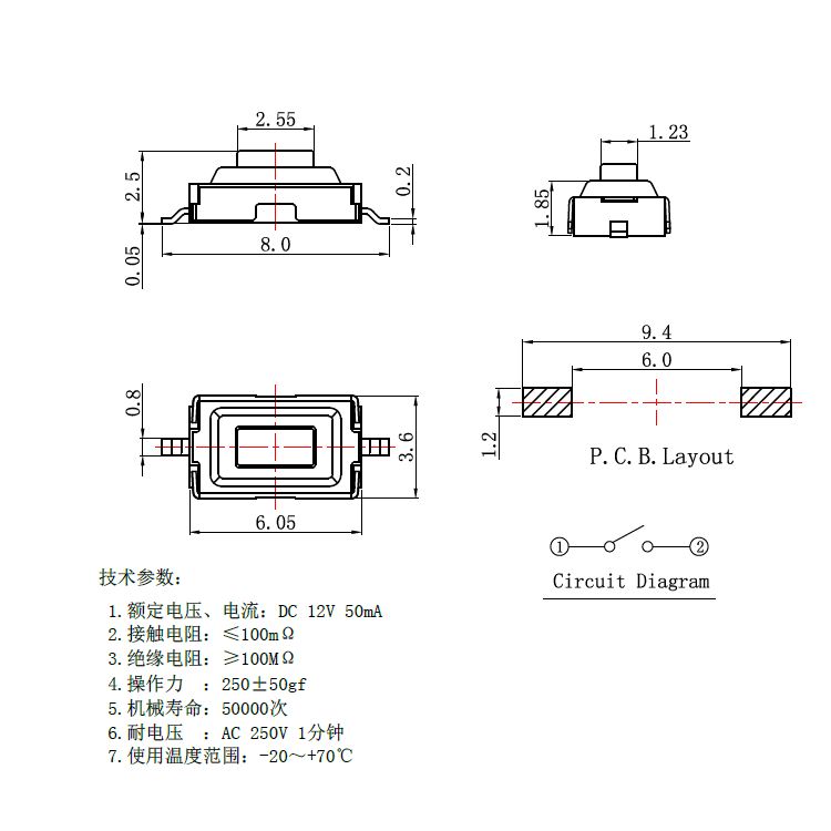 輕觸開關(guān)技術(shù)參數(shù): 1. 額定電流、電壓: DC 12V 50mA 2. 接觸電阻: ≤100mΩMAX 3. 絕緣電阻: ≥100MΩMIN 4. 介電強度: ≥250VAC/1min 5. 回流焊: 250°CMAX 6. 使用溫度: -25 ℃ to 70 ℃ 7. 使用濕度: ≤85% RH 8. 使用壽命: 50000次 應(yīng)用:數(shù)碼、安防、電腦、通訊產(chǎn)品、家用電器、智能家居、穿戴產(chǎn)品等。 |
